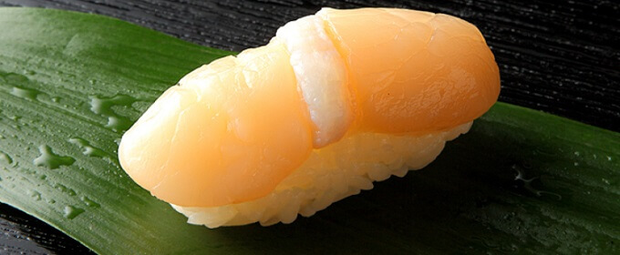 There are three types of scallop sushi in Japan, raw scallop, seared scallop and blanched scallop. A raw scallop sushi is soft and meltingly delicious. A seared scallop sushi is chewier than raw though it is soft. This sushi is often served with butter, lemon, citrus sudachi or mayonnaise. It is salty-sweet taste.